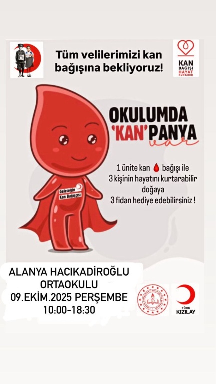 08.10.2025 TARİHİNDE SAAT 10.00-18.30 ARASINDA OKULUMUZDA KIZILAY BÜNYESİNDE KAN BAĞIŞI YAPILACAKTIR. TÜM HALKIMIZDAN DESTEK BEKLİYORUZ.
